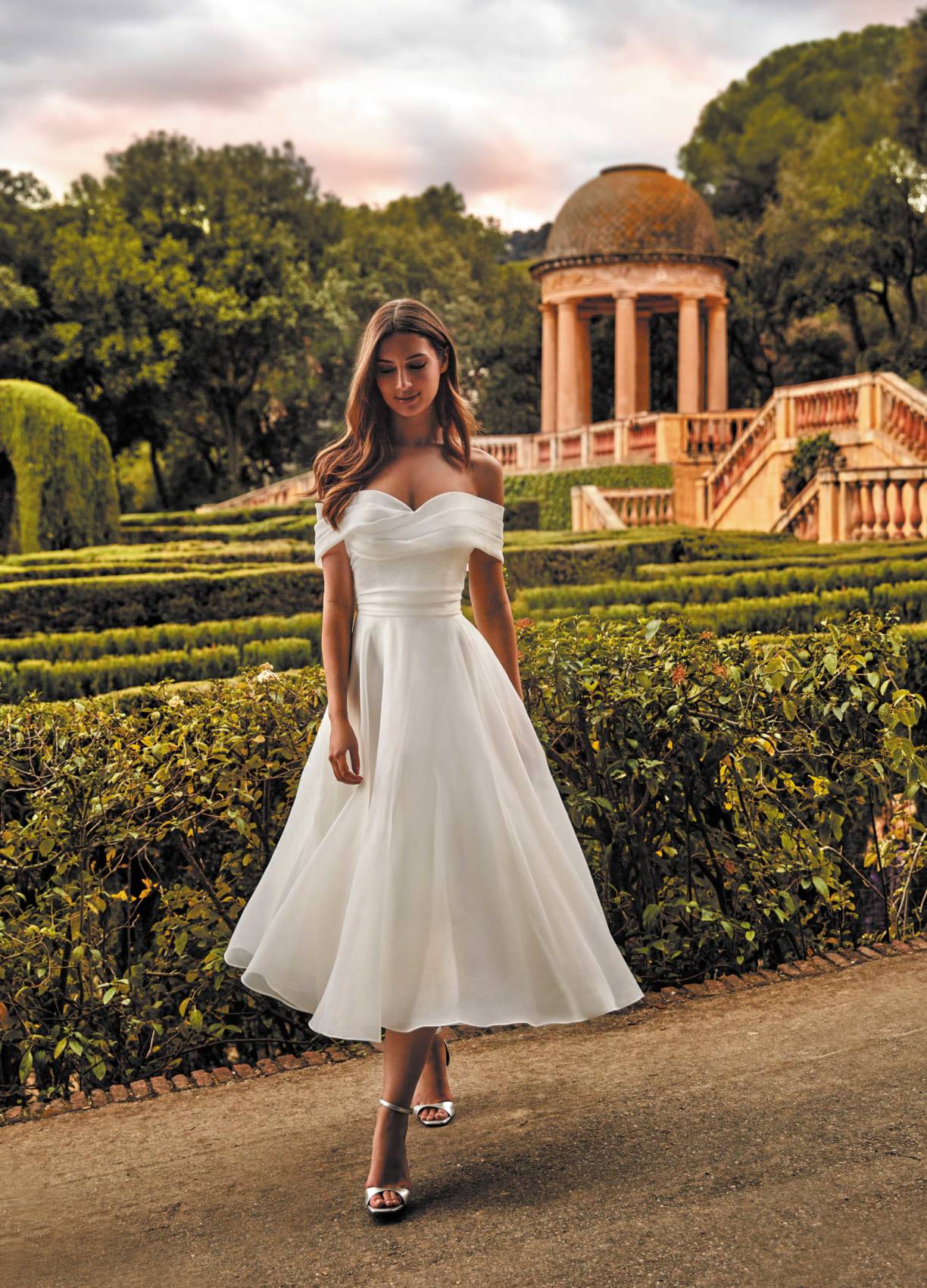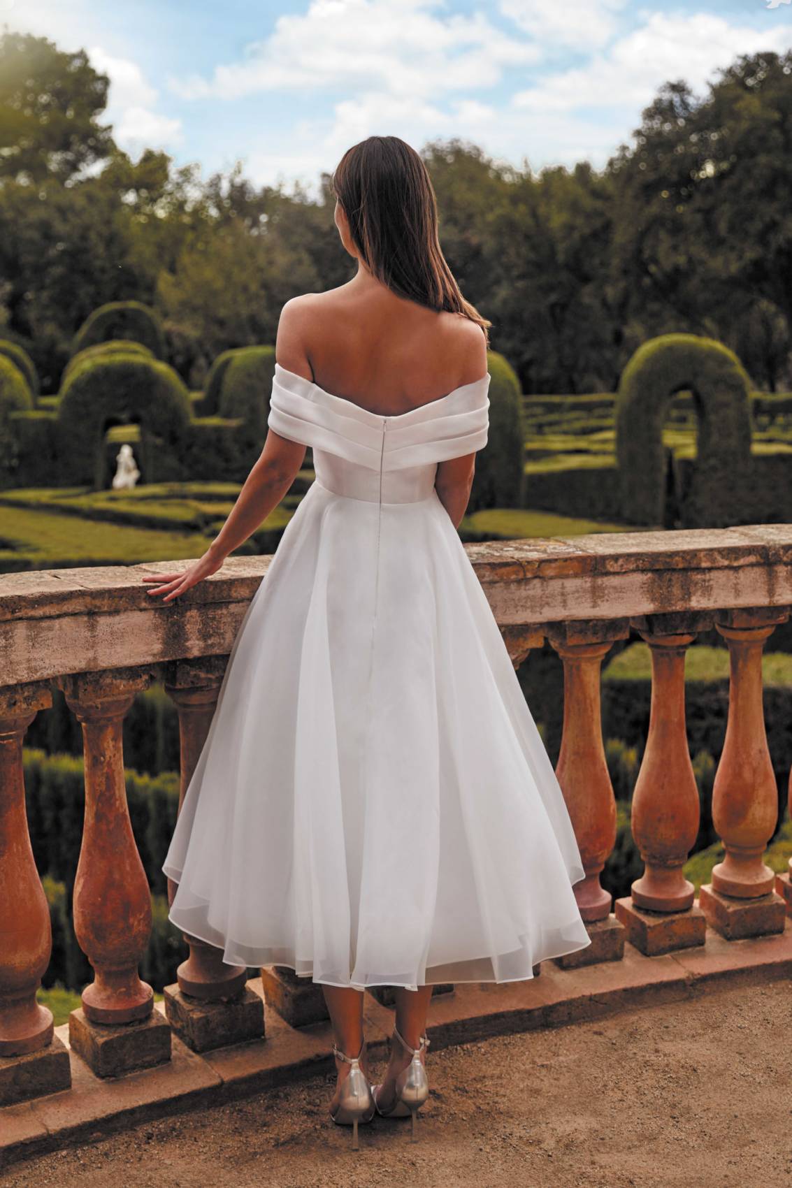 Voici une jolie petite robe courte à encolure bateau entièrement fabriquée en organza.