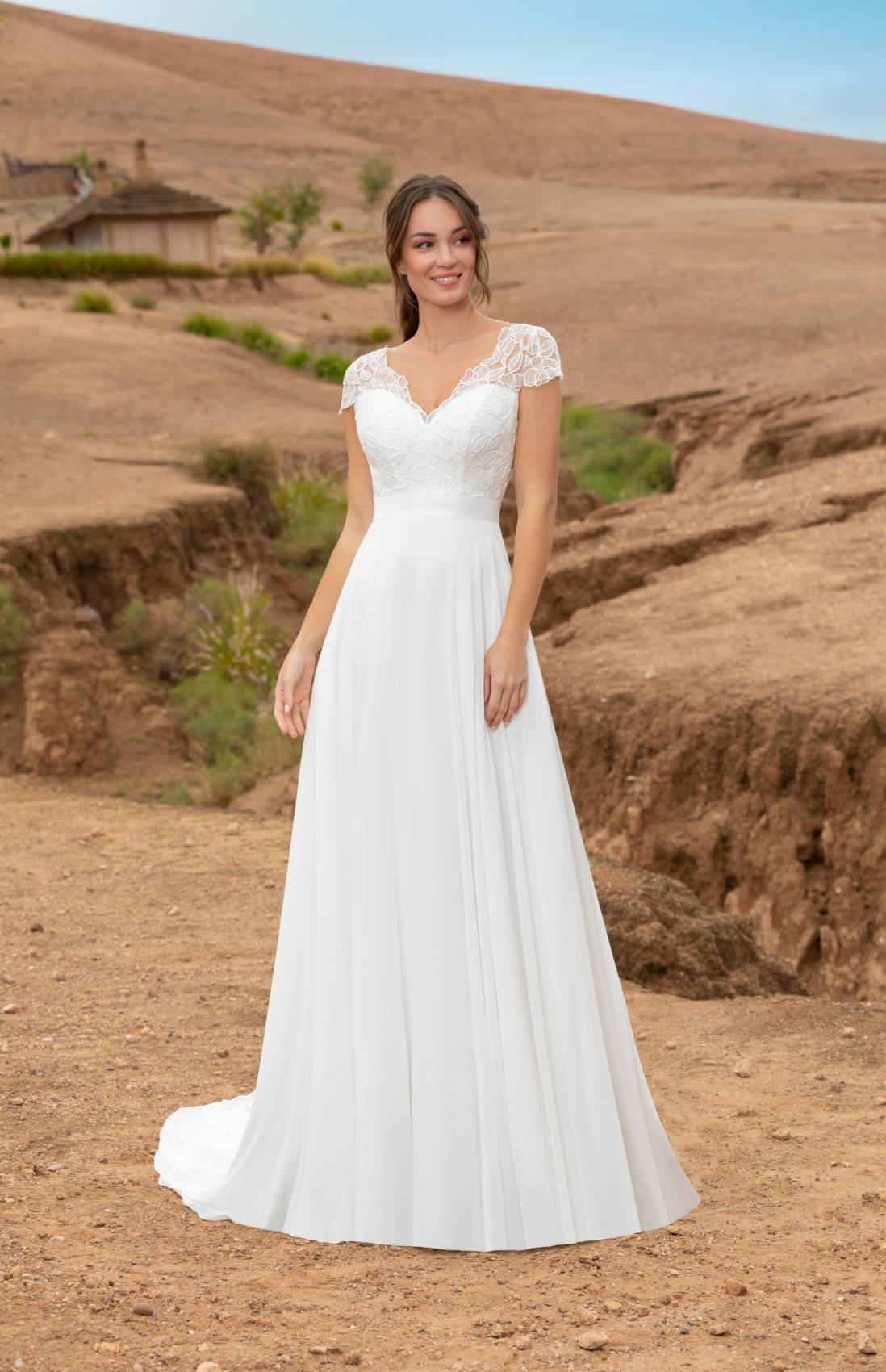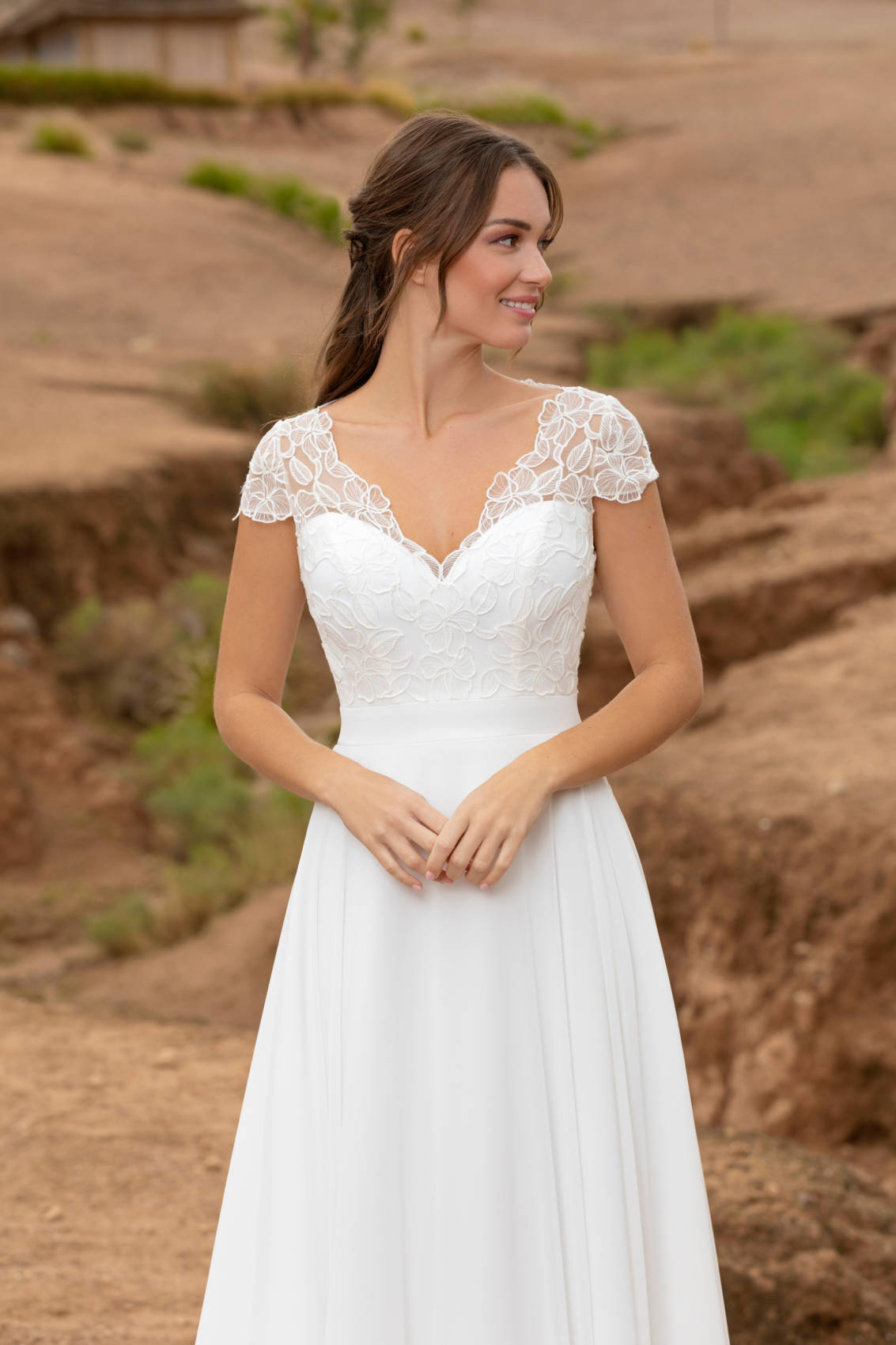 Son haut en dentelle « feuille » super moderne et sa jupe en mousseline lui donne un côté aérien et un style bohème.