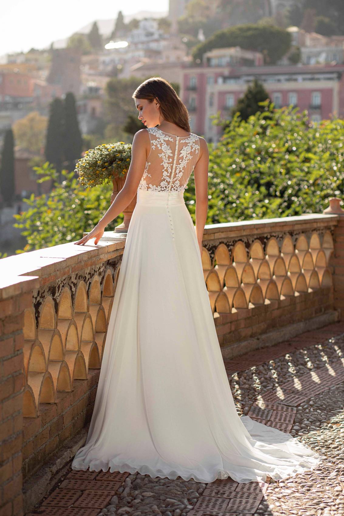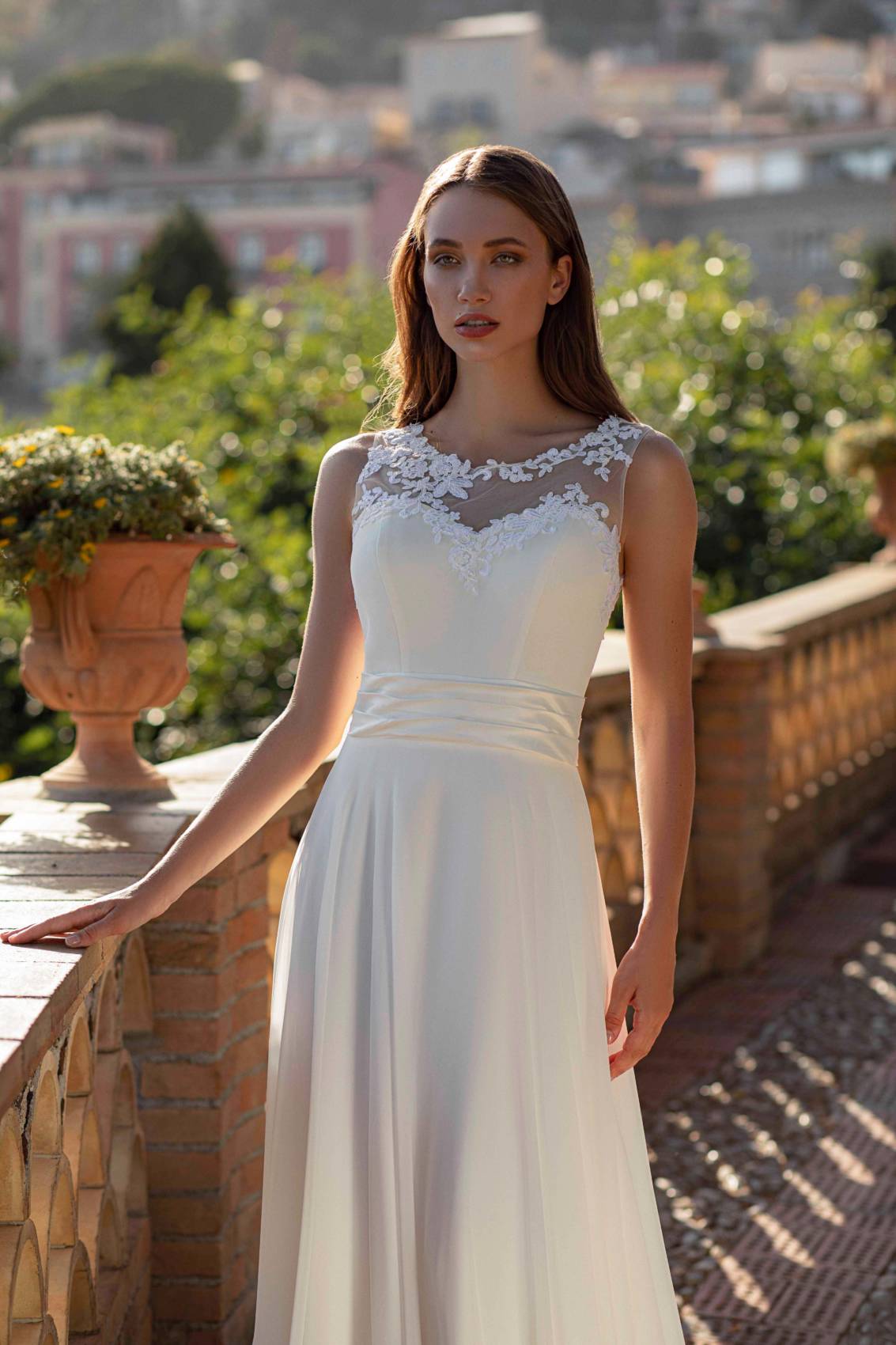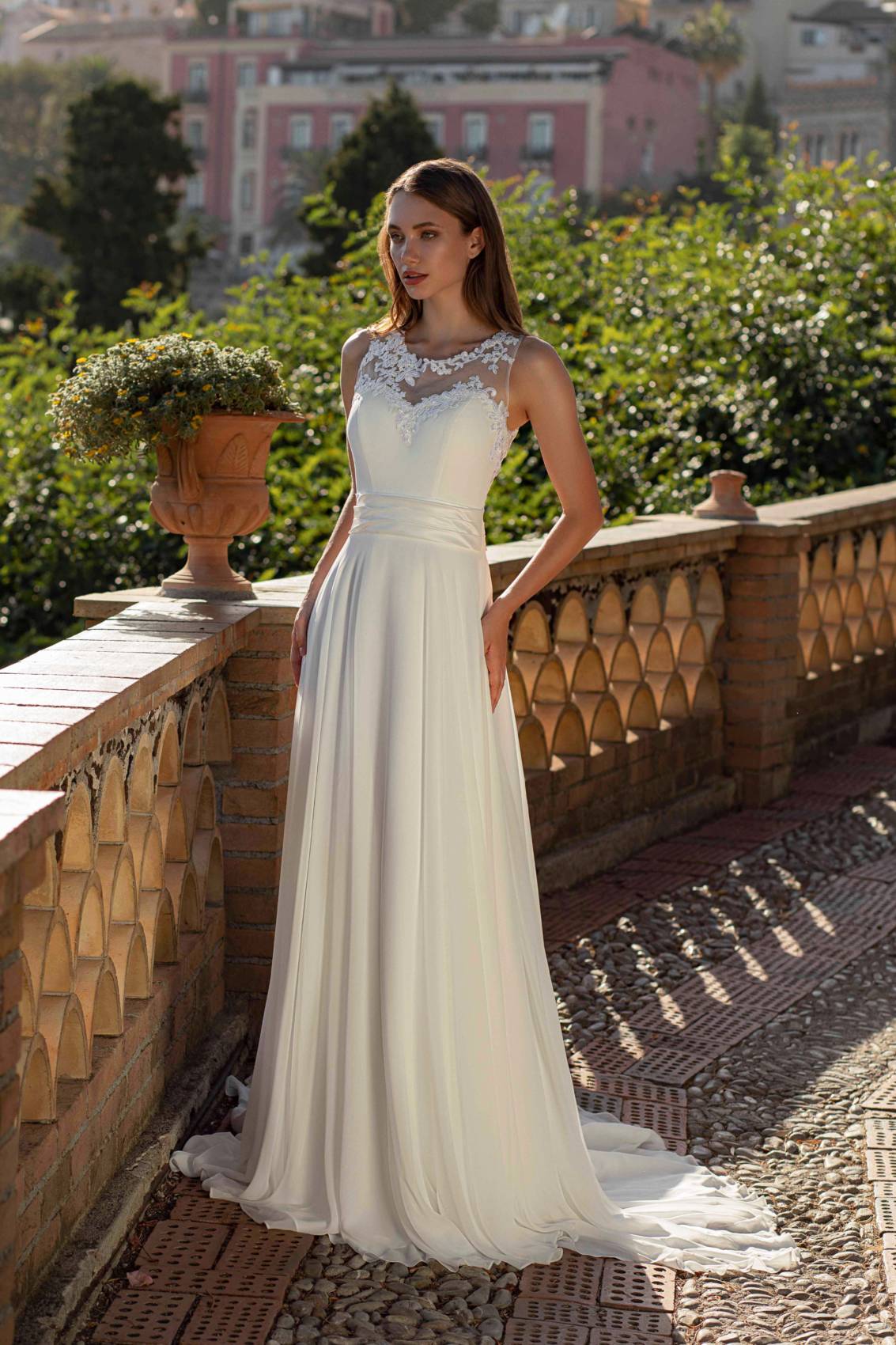 La taille est soulignée par une ceinture en voile.
