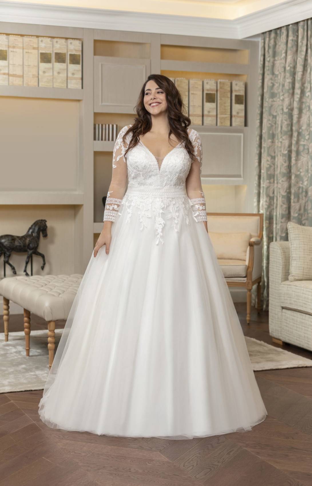 Son haut est composé de dentelle et de tulle et la jupe est en tulle.