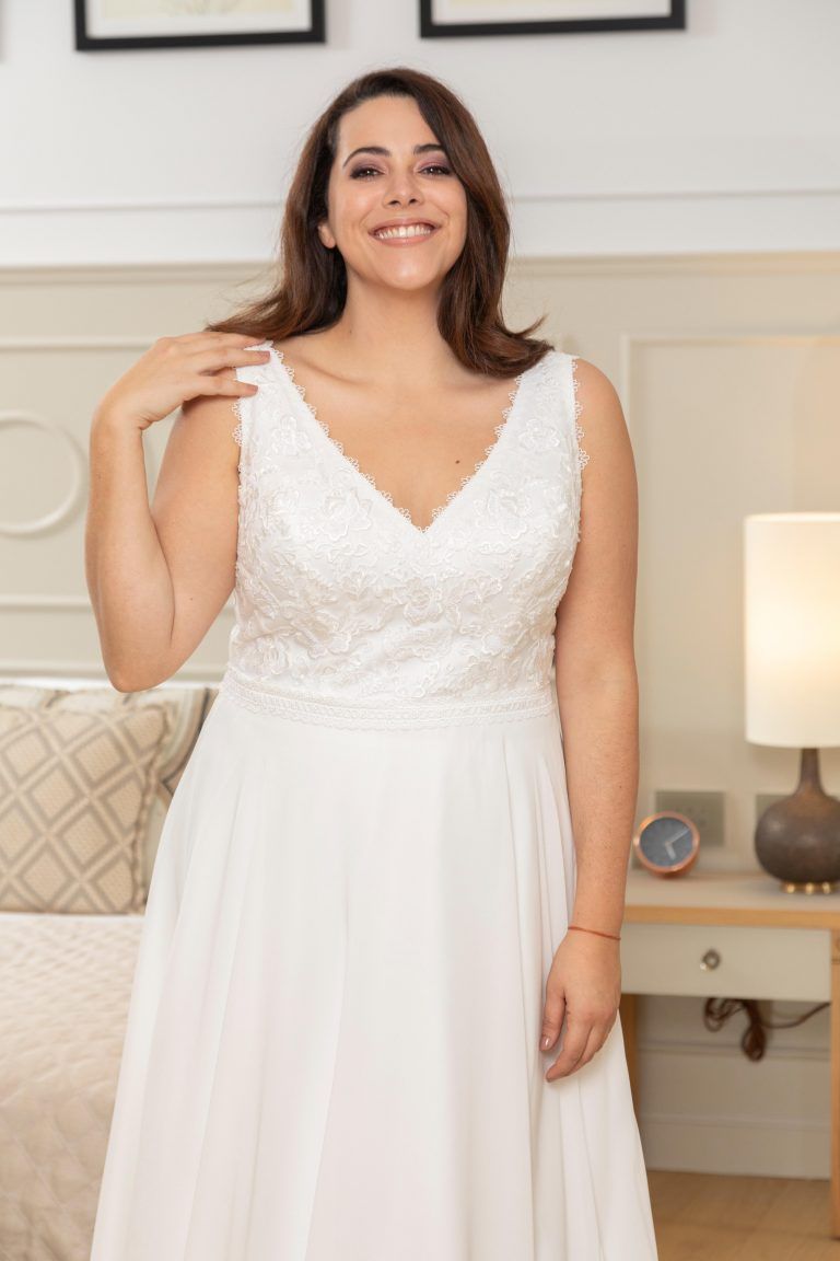 Le haut de la robe se compose d’une petite dentelle fine et montée sur tulle.