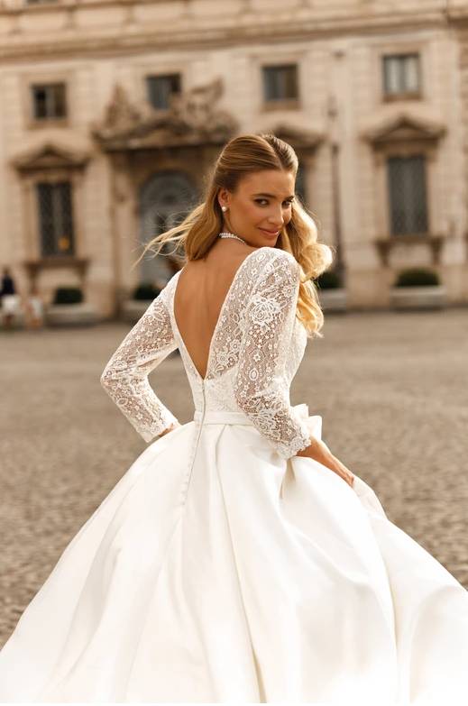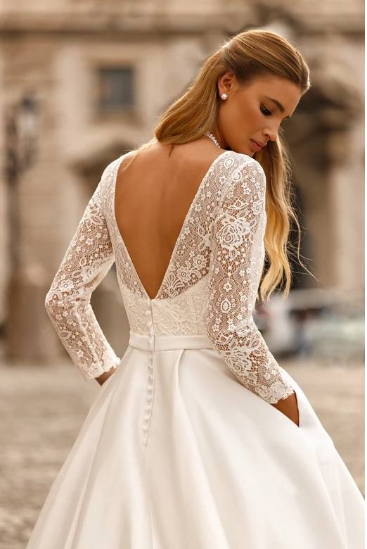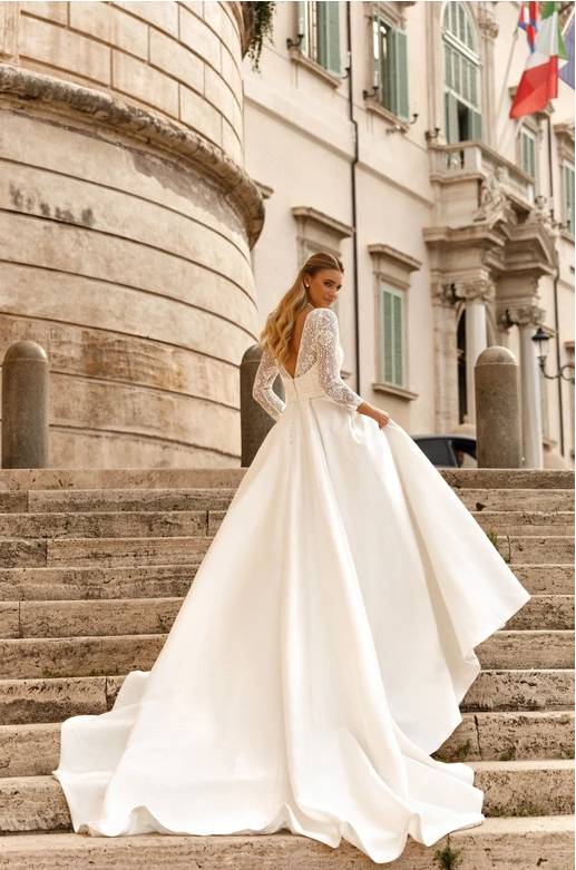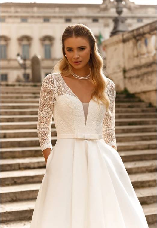 Conçue pour sublimer la silhouette, elle met en valeur la taille grâce à sa taille haute et son corset. Avec son haut en dentelle, ses manches 3/4 et sa jupe en mikado cette robe personnifie l’élégance