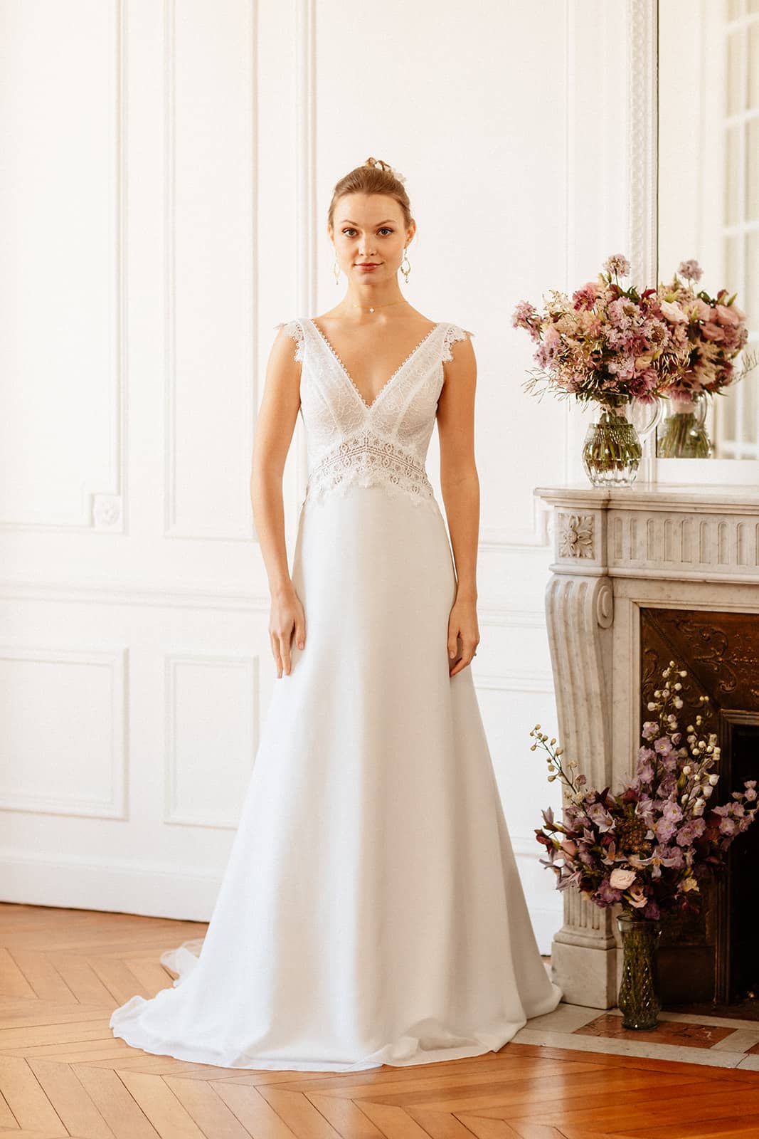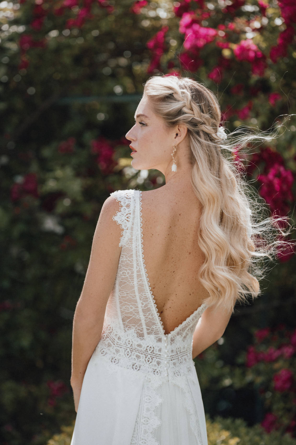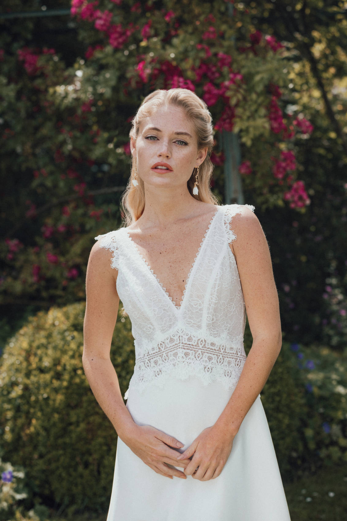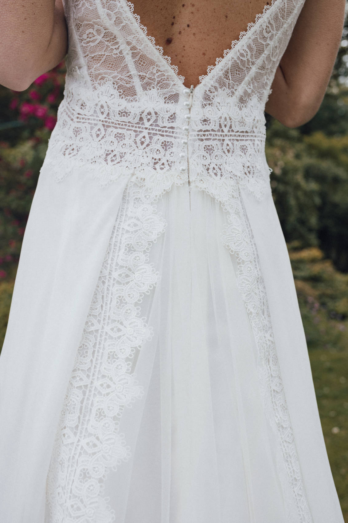 C’est une robe qui va sculpter votre silhouette et mettre en valeur votre féminité. Son décolleté et sa ceinture sous poitrine ainsi que la traine en dentelle et le mélange de galons, de dentelle et mousseline fluide c’est l’ADN Elsa Gary.
