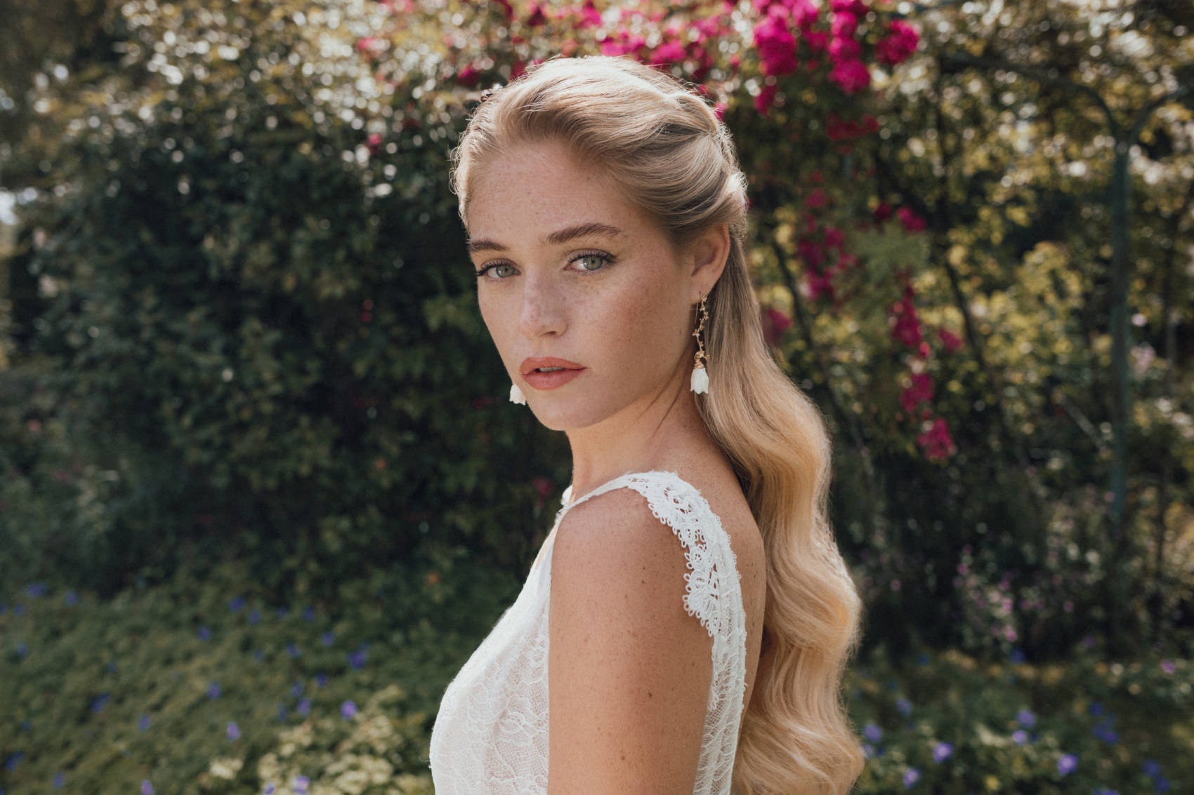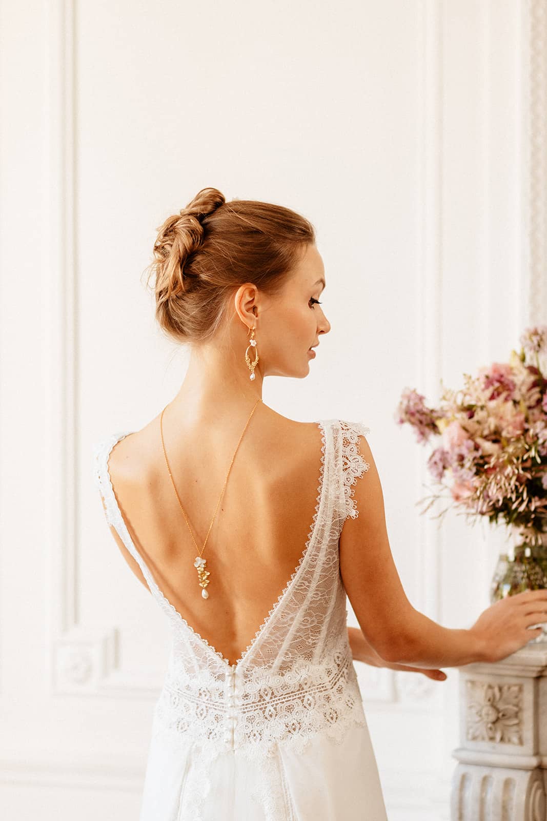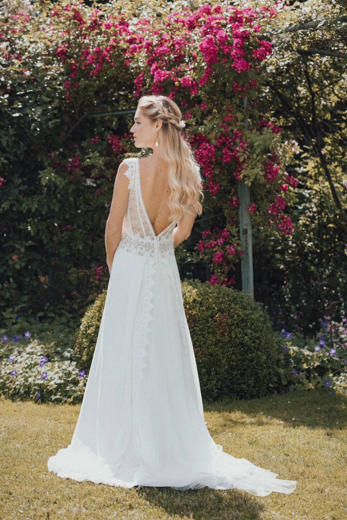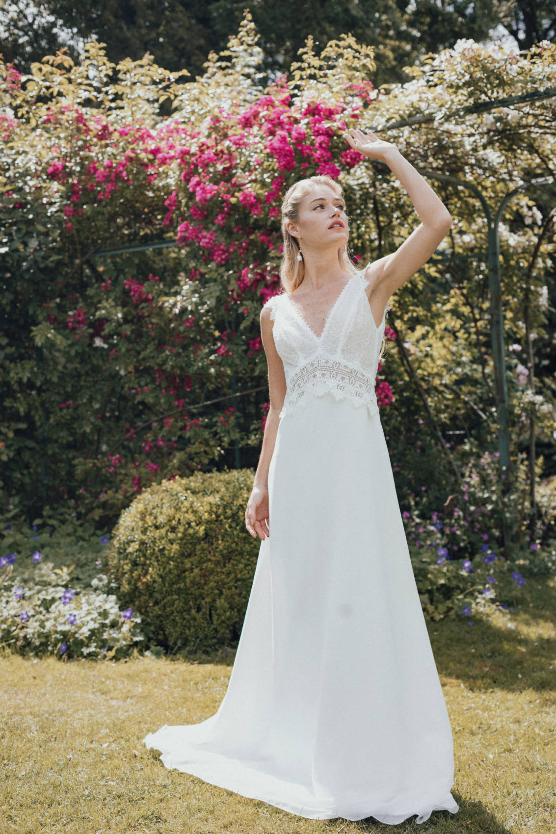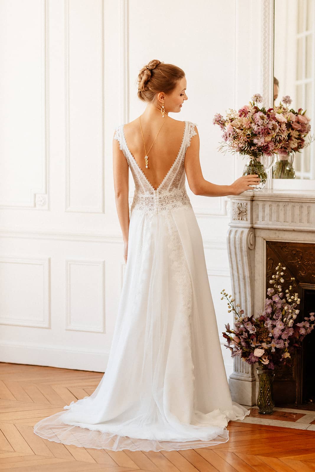 C’est une robe qui va sculpter votre silhouette et mettre en valeur votre féminité. Son décolleté et sa ceinture sous poitrine ainsi que la traine en dentelle et le mélange de galons, de dentelle et mousseline fluide c’est l’ADN Elsa Gary.