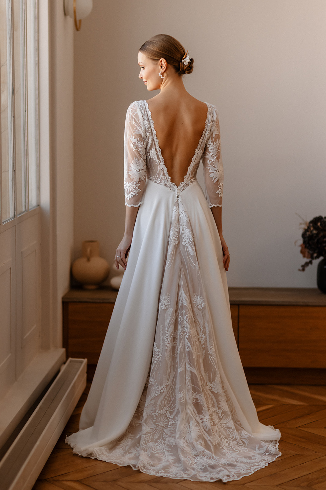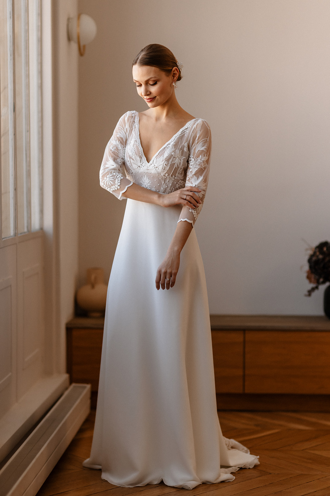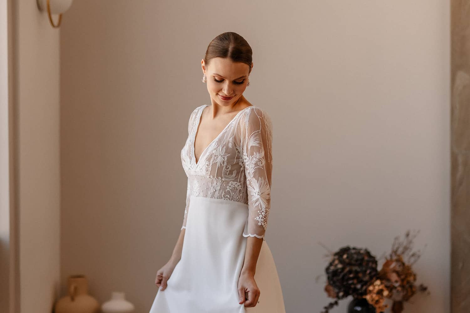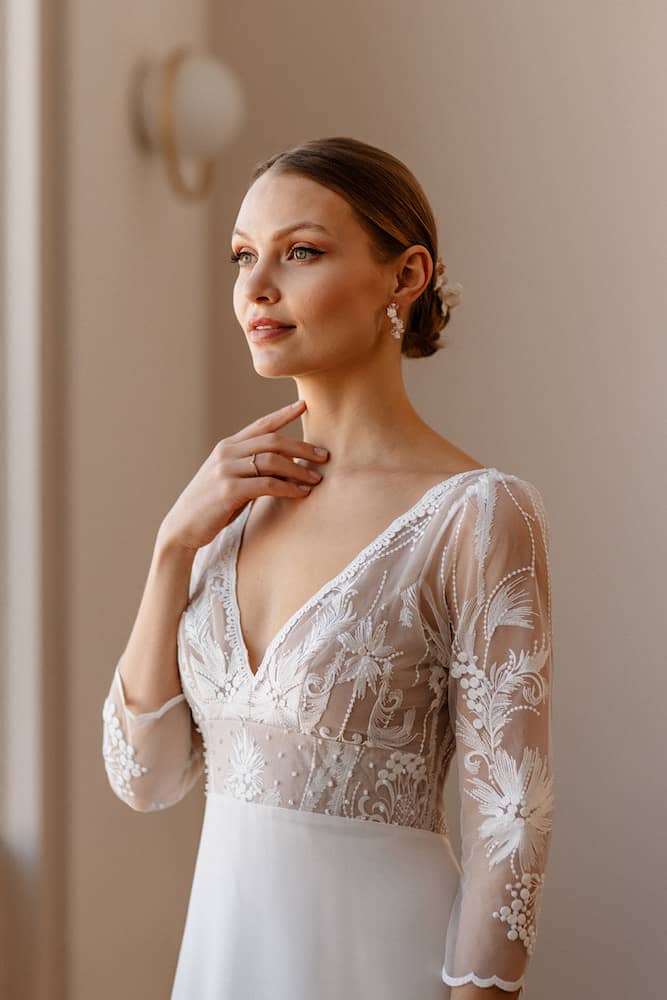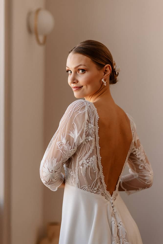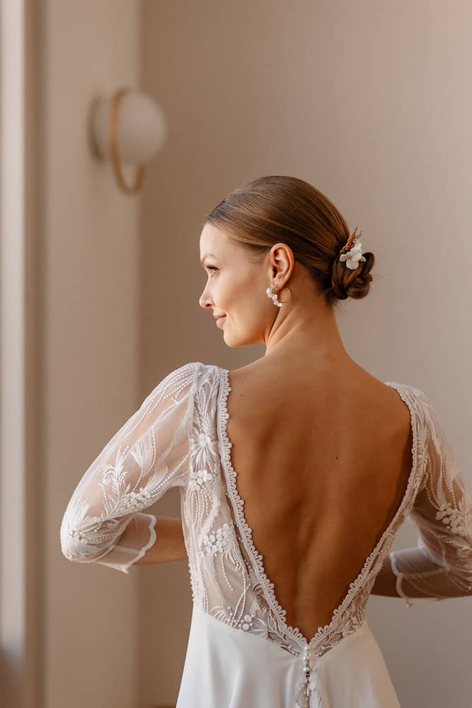 Sous le charme de ce modèle qui ira à toutes les morphologies. Elle a tout pour plaire. Un haut décolletée en V orné de cette dentelle fleurie, la ceinture sous poitrine pour marquer la taille avec son plumetis. Le bas de la robe est en mousseline recyclée, elle est légère et fluide et dans le dos elle impressionne par l’élégante traîne de dentelle doublée de tulle nude. A essayer et à personnaliser selon vos envies, jupe en tulle, manches courtes ou dos en forme papillon. Laissez-vous séduire par la douceur de notre collection.