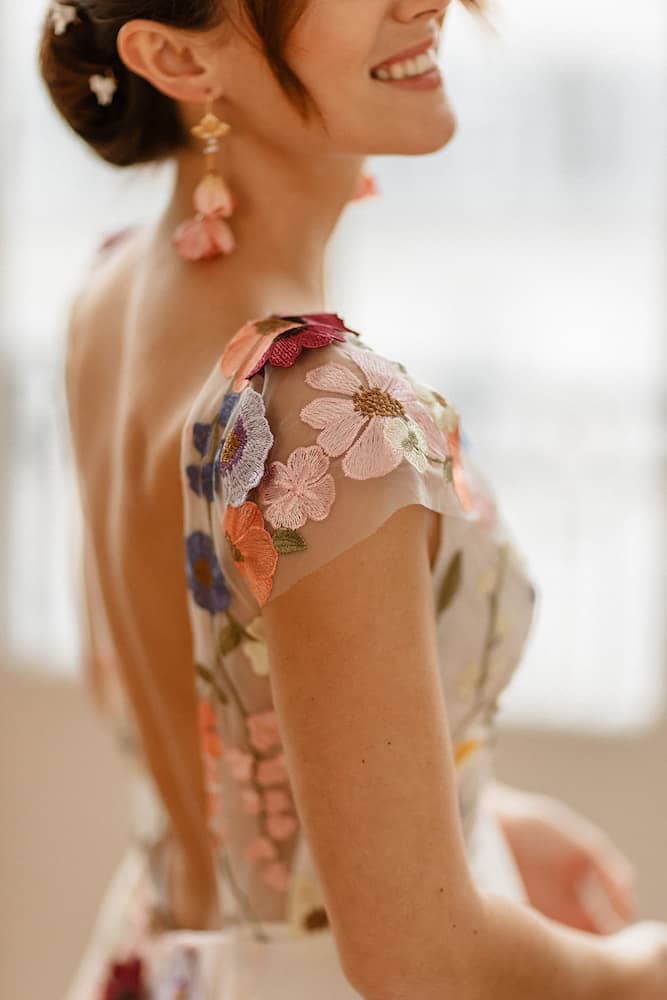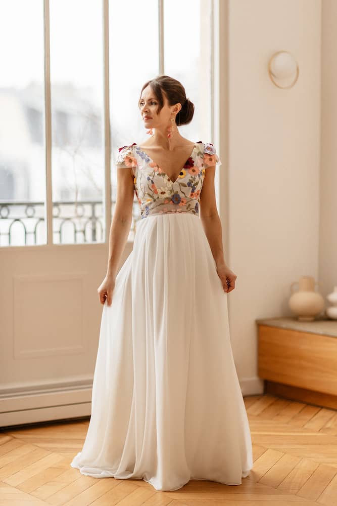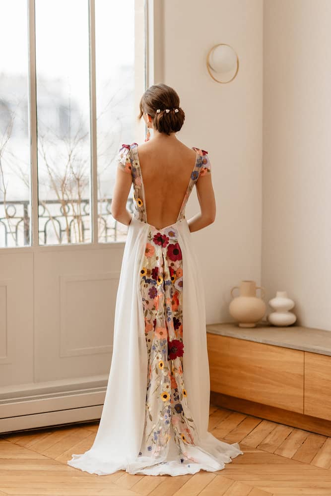 Cette robe unique c’est l’assurance de se démarquer, l’originalité du tissu avec ses fleurs brodées de toutes les couleurs et son dos incroyable.