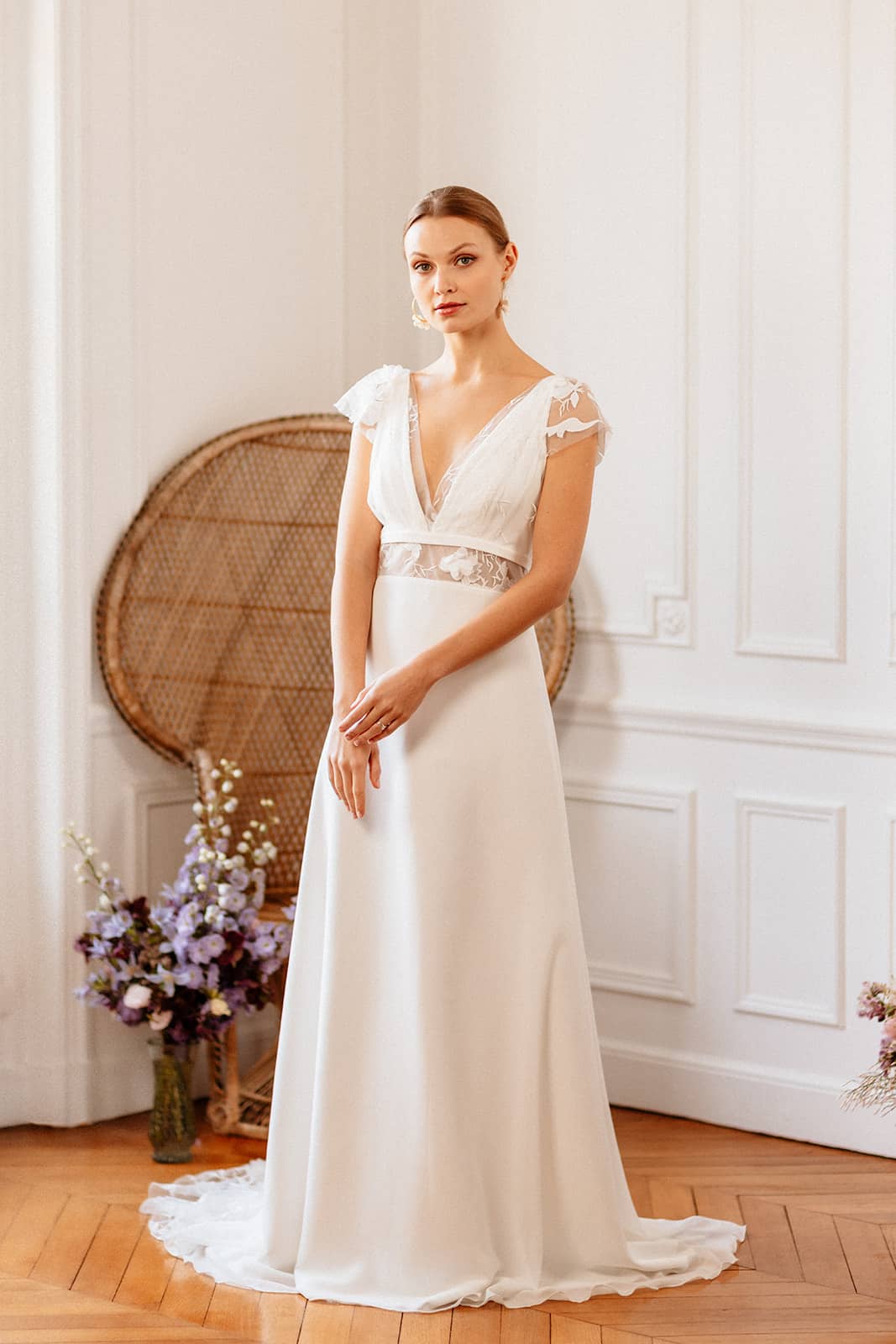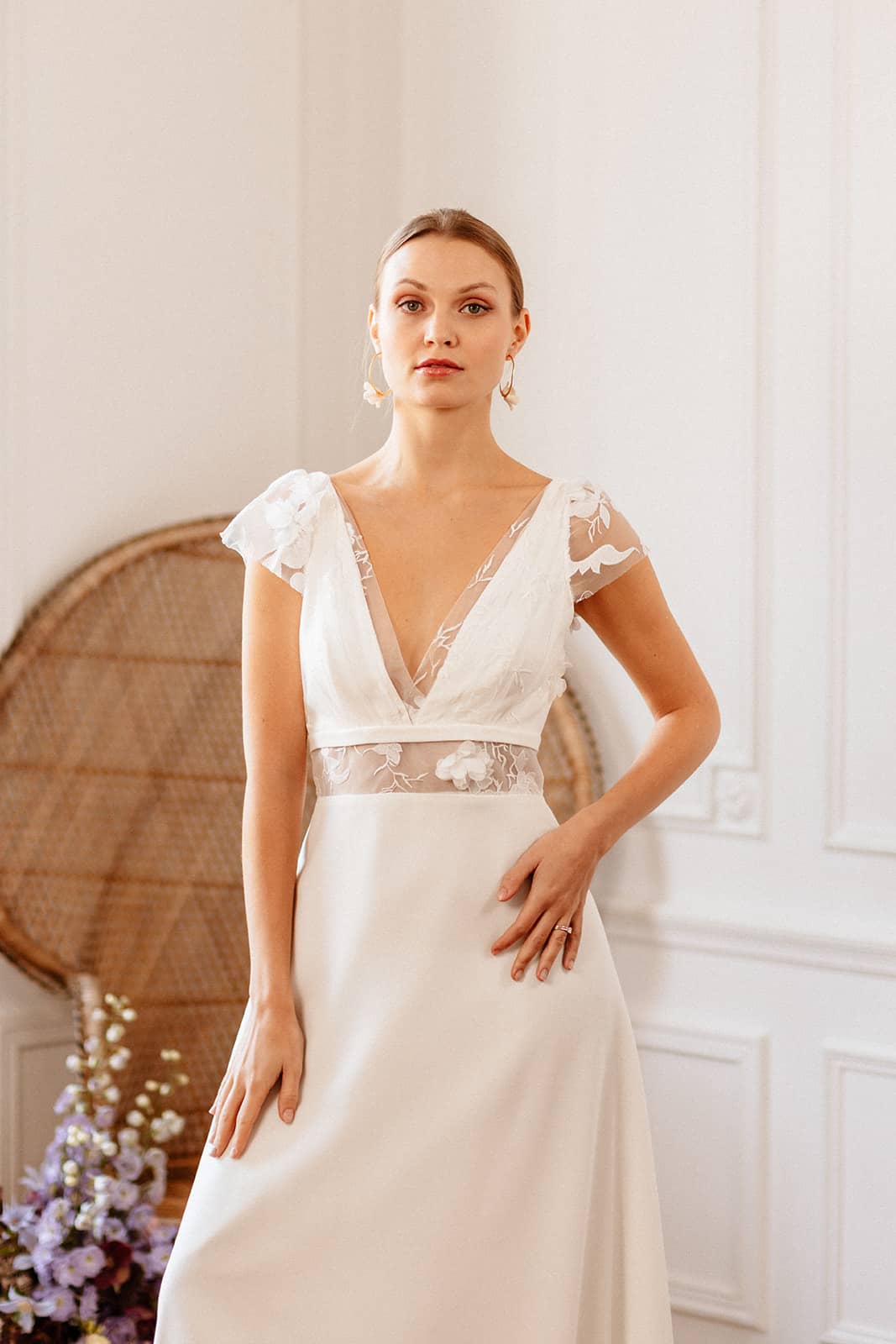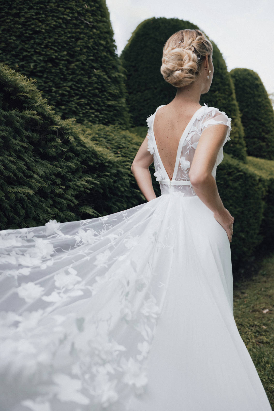 Vous aimez les fleurs ? Le décolleté est plissé avec des incrustations de fleurs soigneusement cousues, la ceinture qui épouse la taille et la mousseline apporte la légèreté et au dos la magie opère grâce à cette magnifique cascade de fleurs.