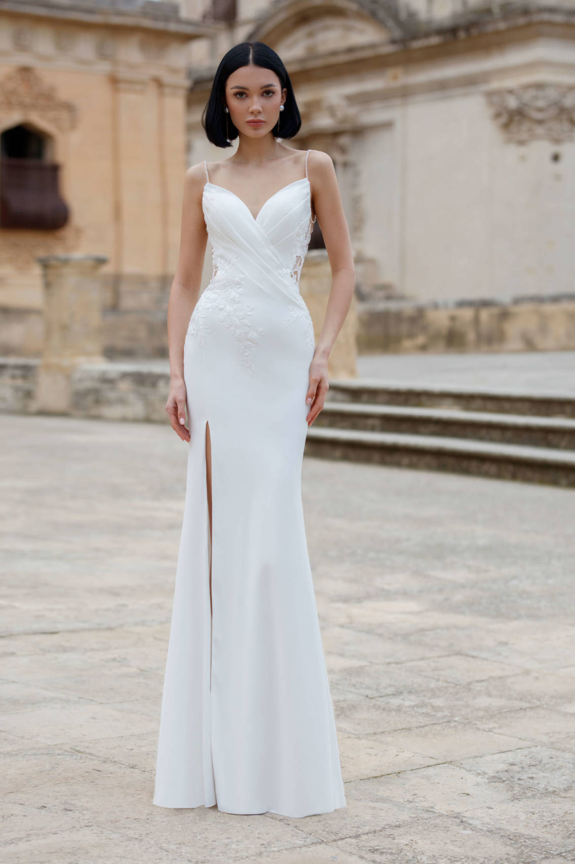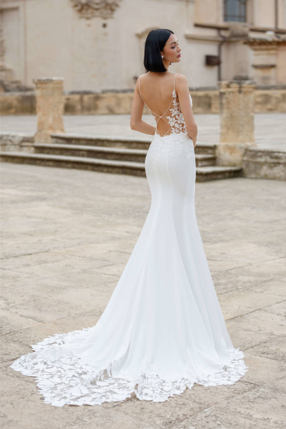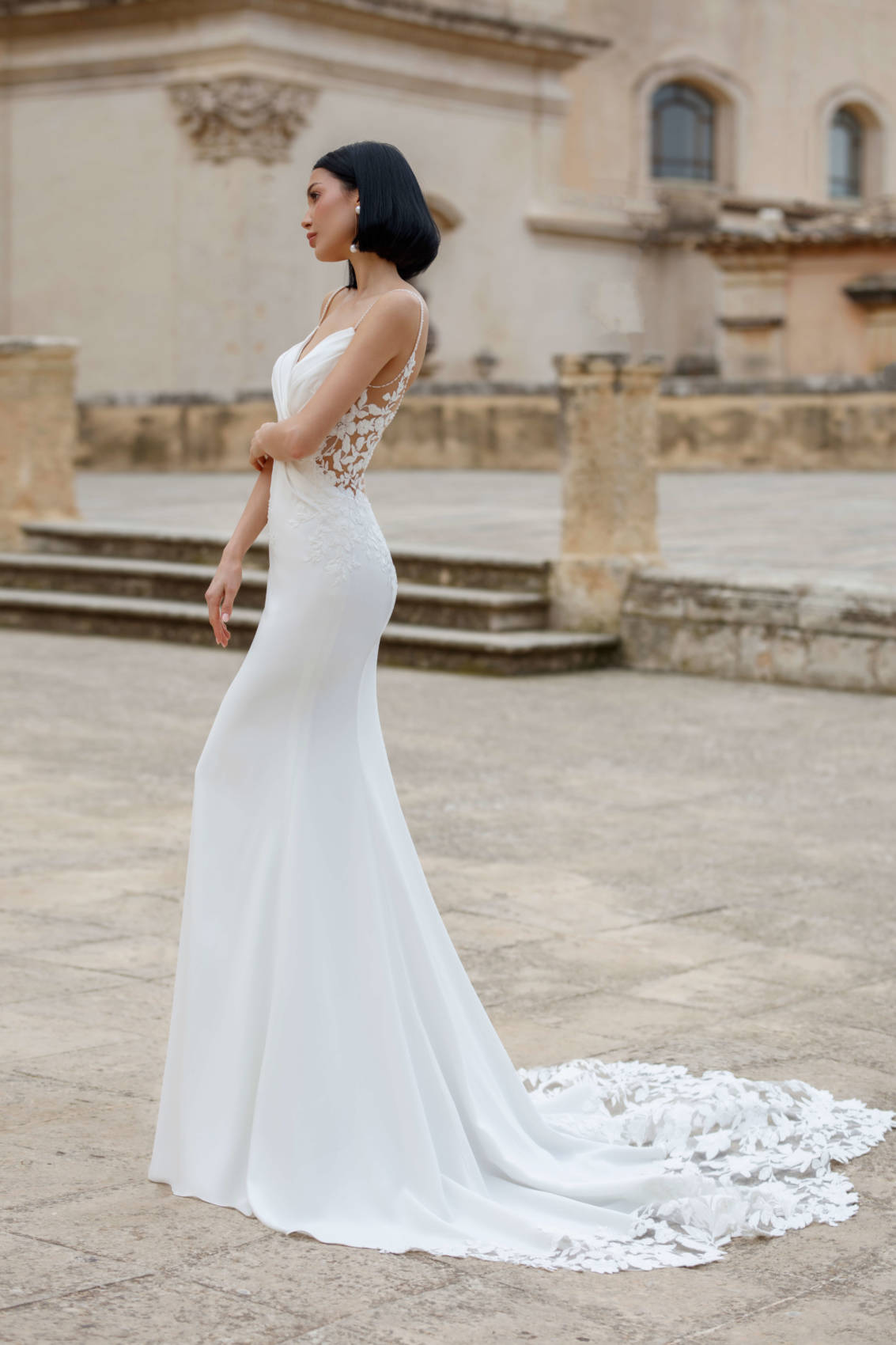 Cette robe en crêpe propose un superbe drapé au niveau de la poitrine. Deux fines bretelles en strass arrivent vers le dos pour vous proposer une fermeture papillon en dentelle. Enfin, la traîne se termine par de la dentelle.