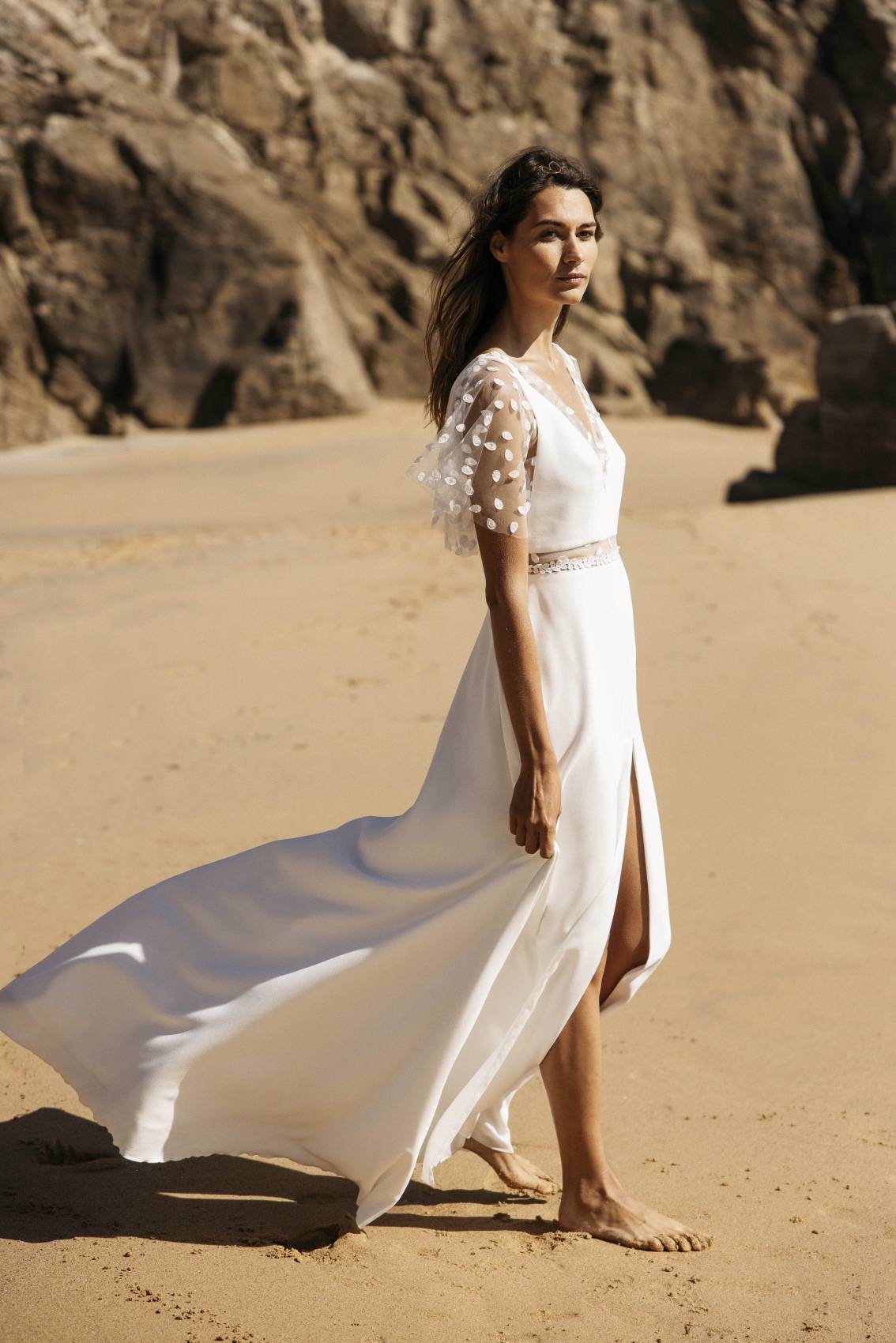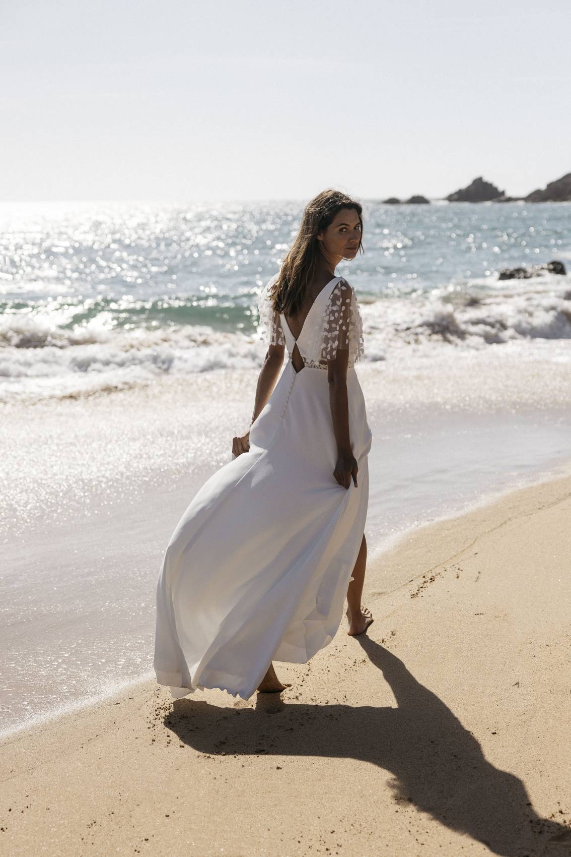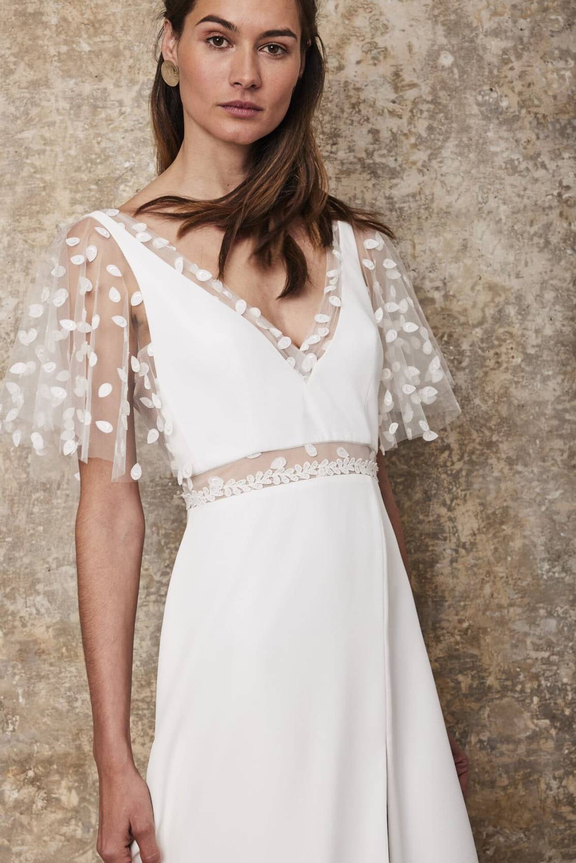 On aime ses petites « manches » volantes et délicates. Sa coupe est juste parfaite! Toute la robe est composée de crêpe, ce qui lui apporte un joli tombé.