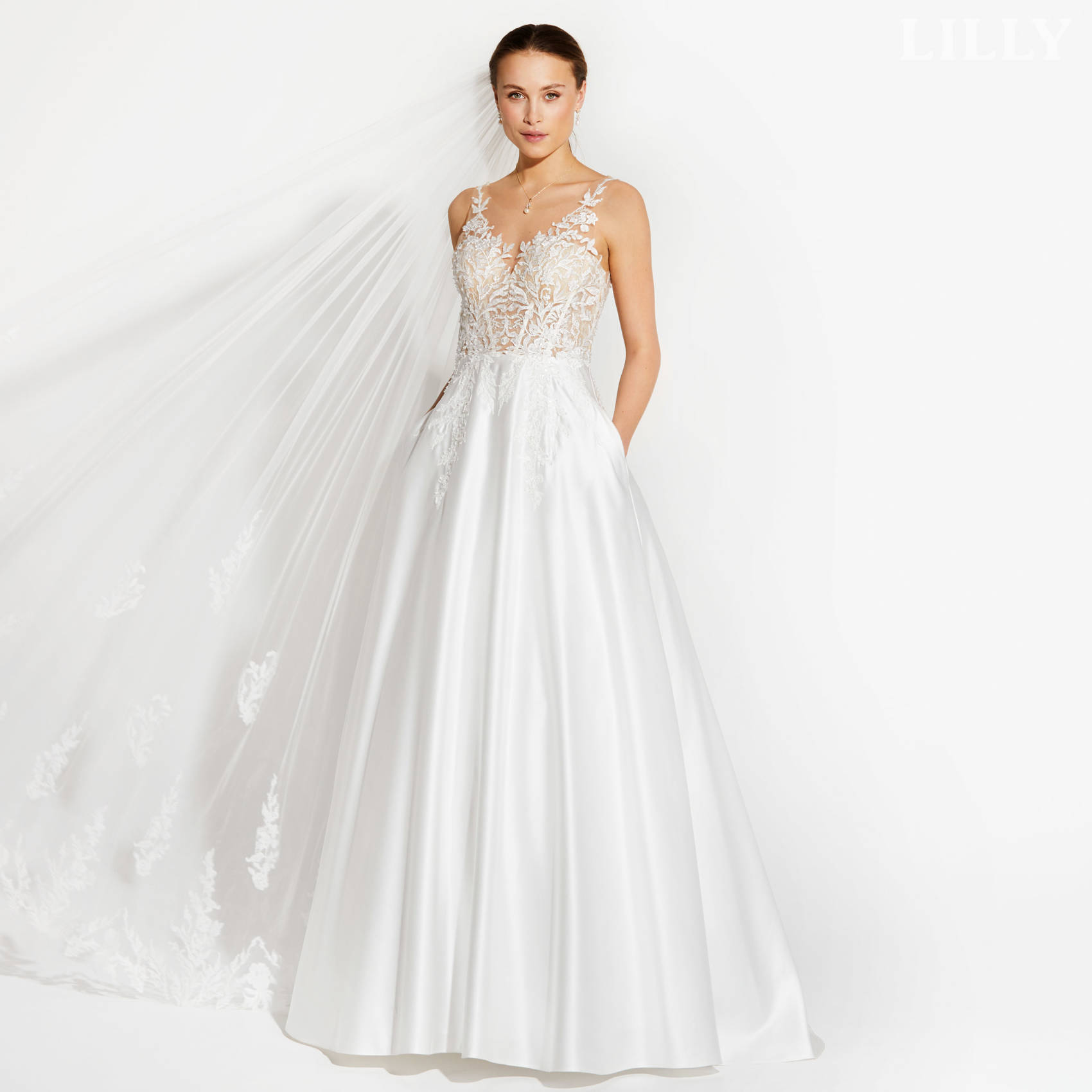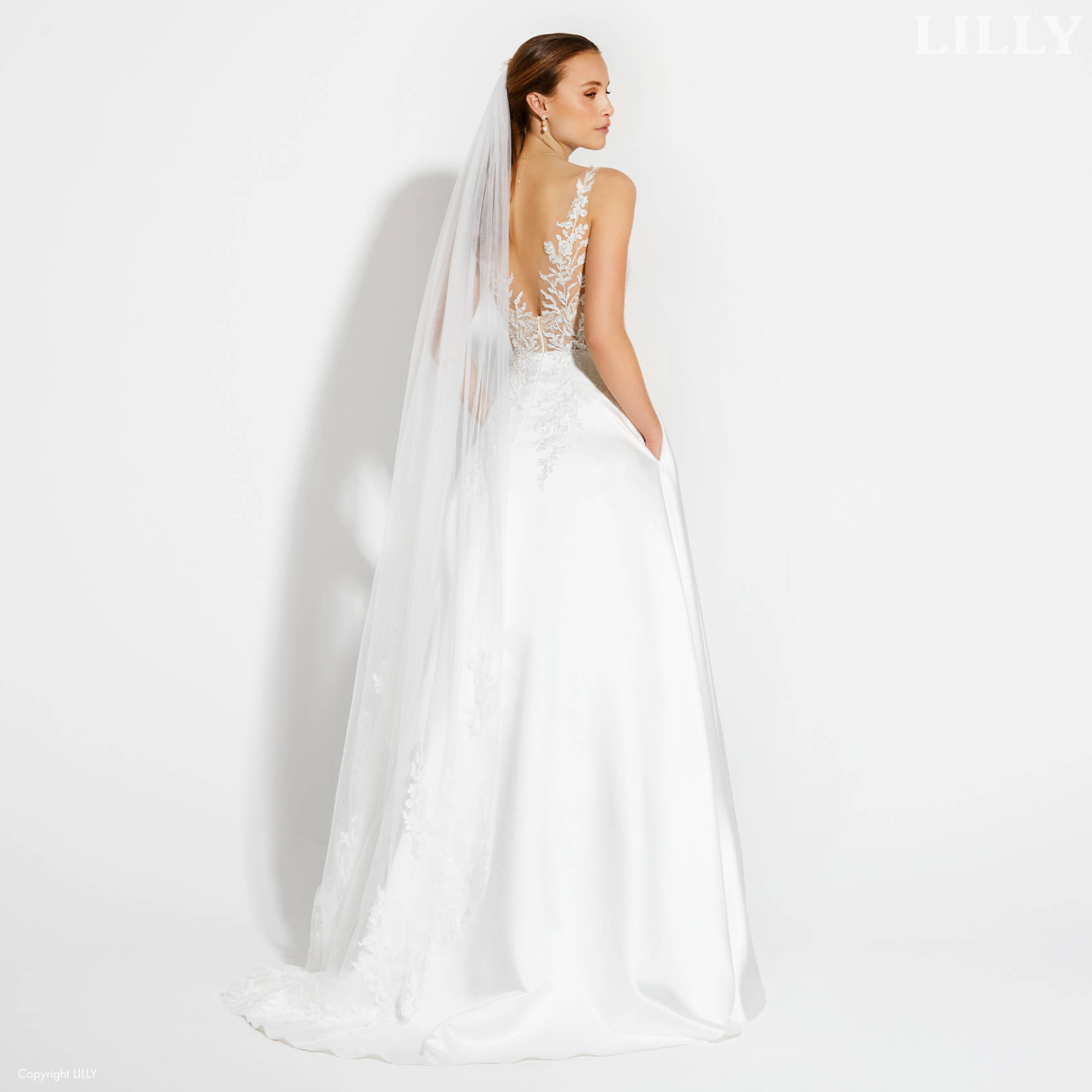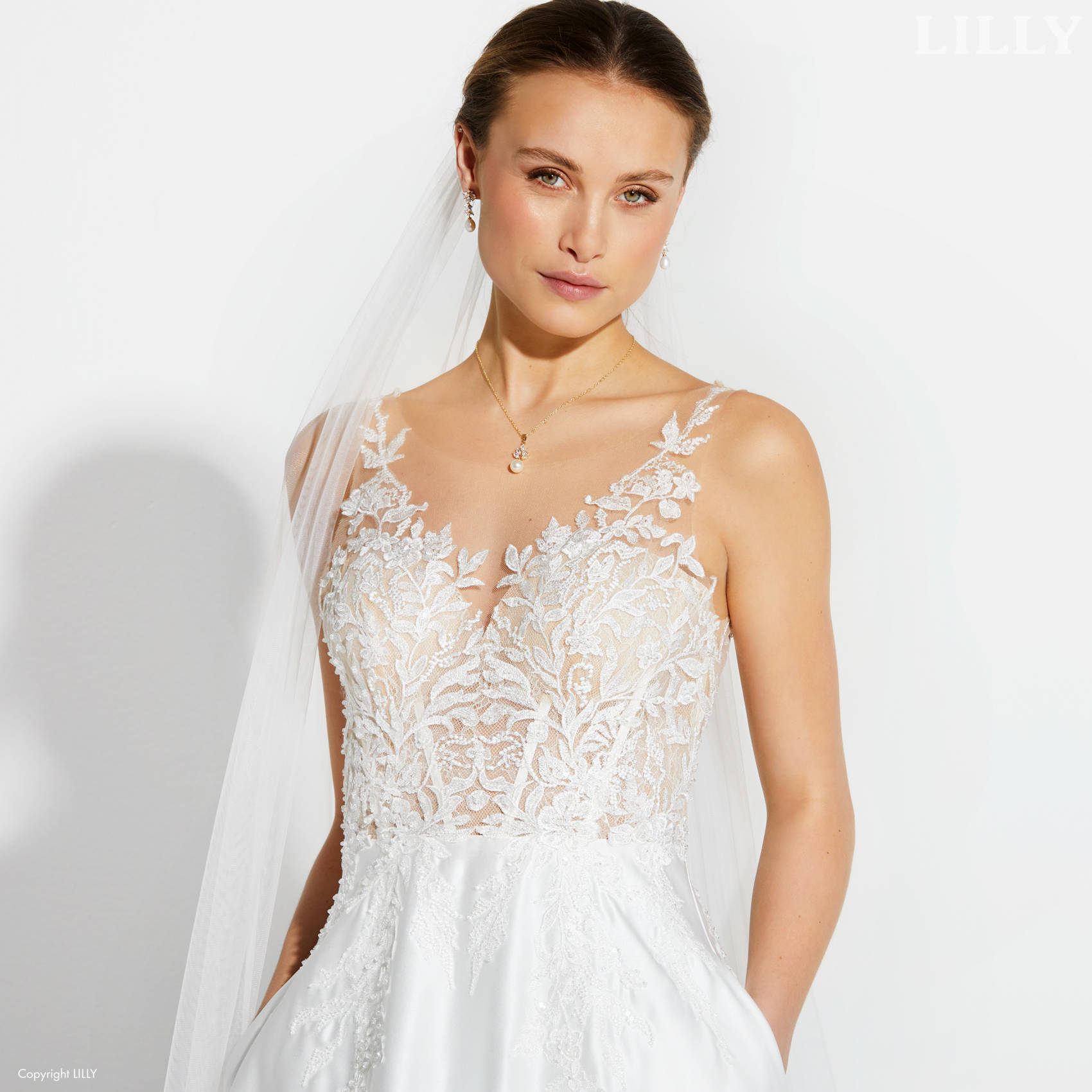 Ce magnifique modèle se compose d’un haut en dentelle avec une belle jupe en satin souple.