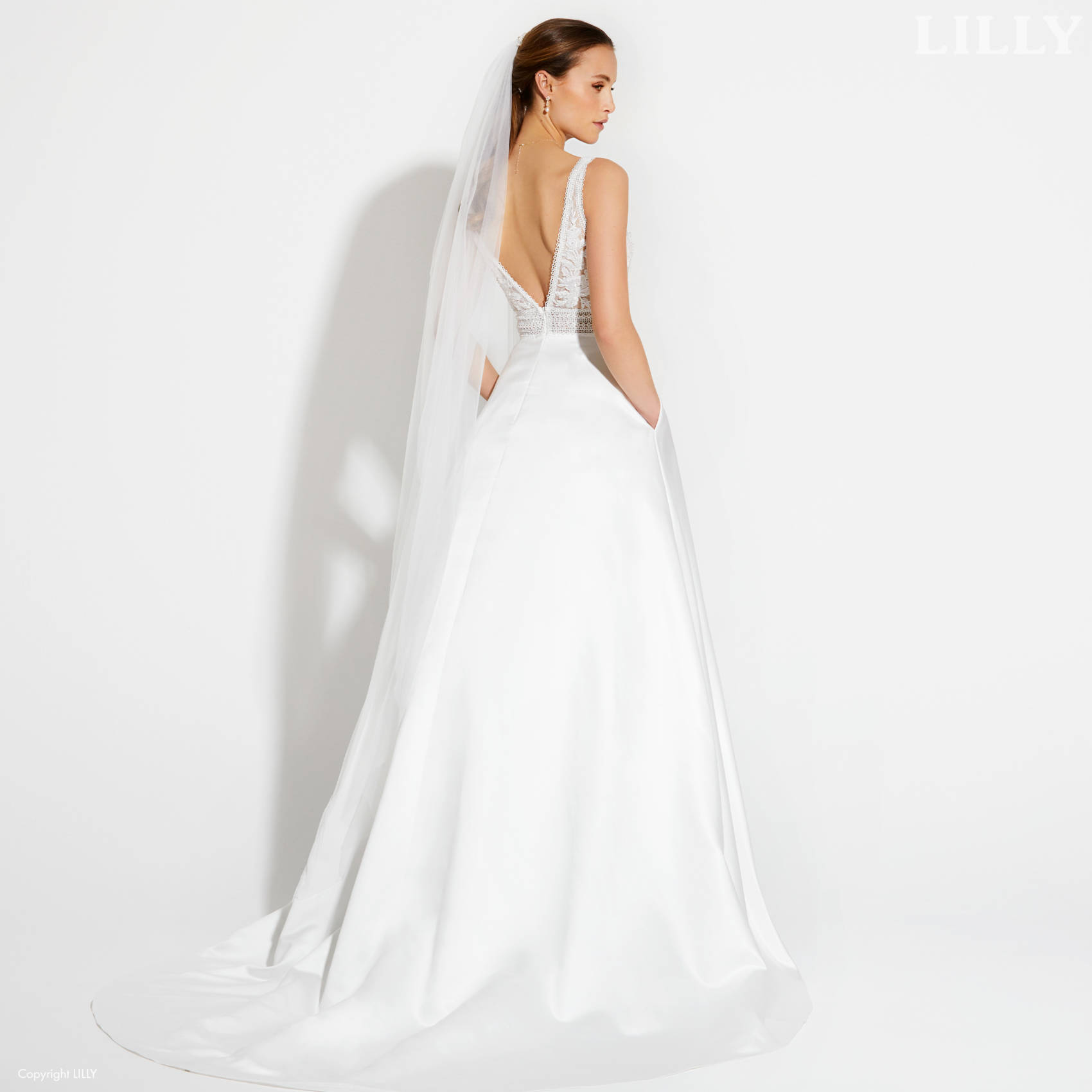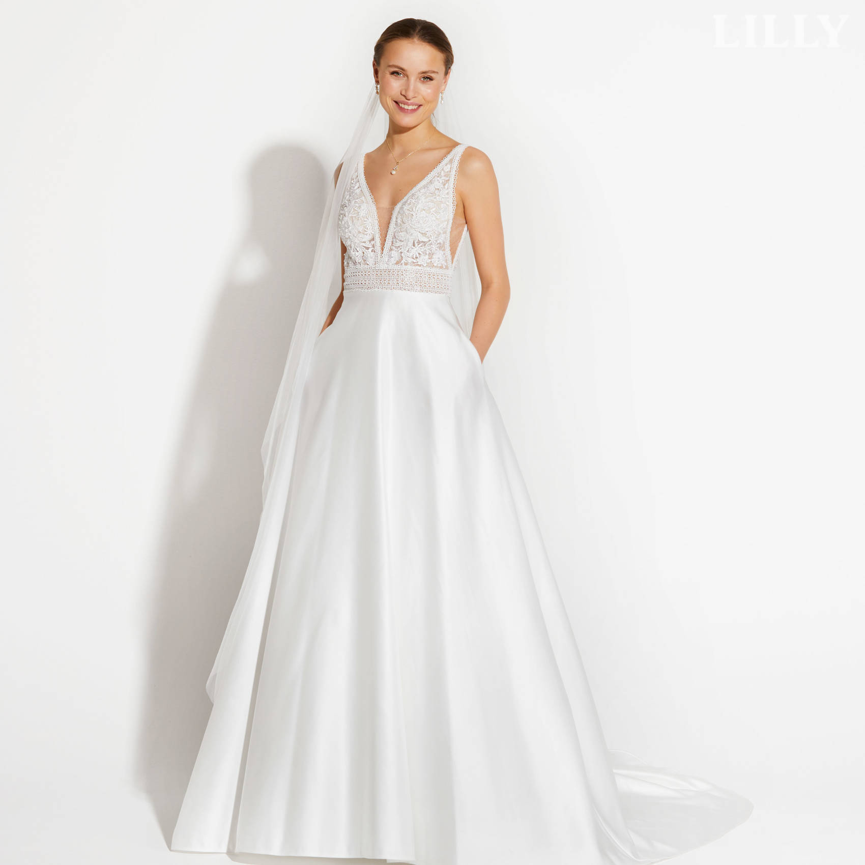 Avec son haut en dentelle perlée et sa jupe en satin, cette robe est digne des princesses modernes.