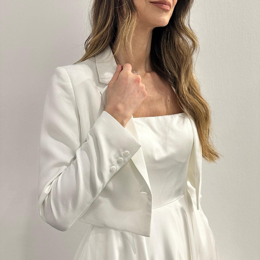 Vous l’attentiez toutes, ils l’ont fait!!! Voici enfin sorti la petite veste crop qui convient parfaitement aux robes de mariées. Sa couleur est ivoire et elle est confectionnée en crêpe. Le crêpe est une matière qui s’associe parfaitement au voile, à la dentelle, mais également au tulle.