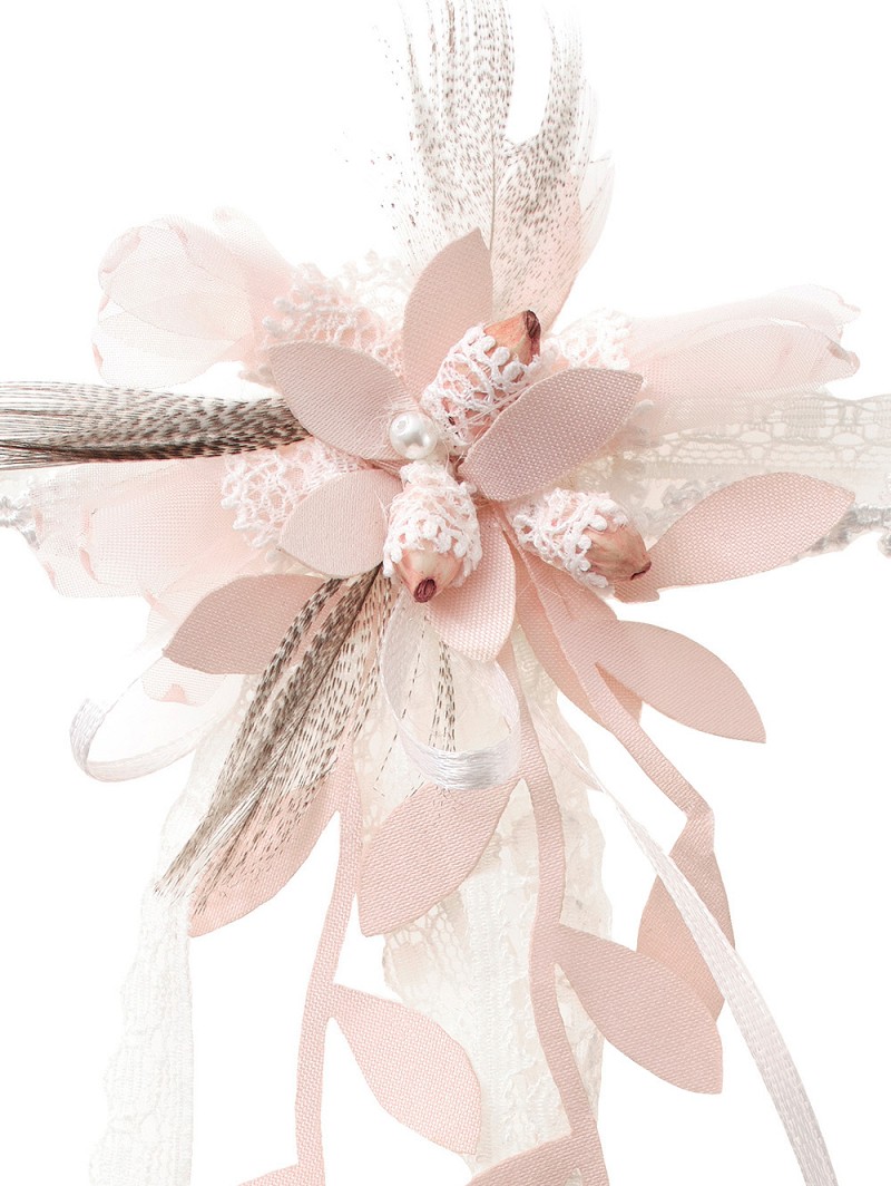 - Signes : Jarretière ivoire, feuilles blush, fleurs blush, plumes naturelles