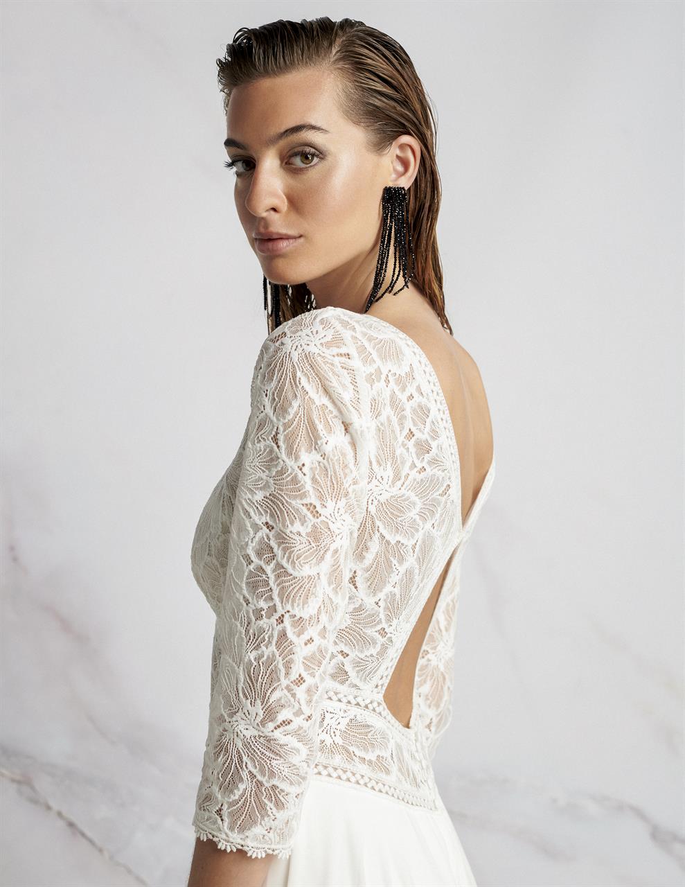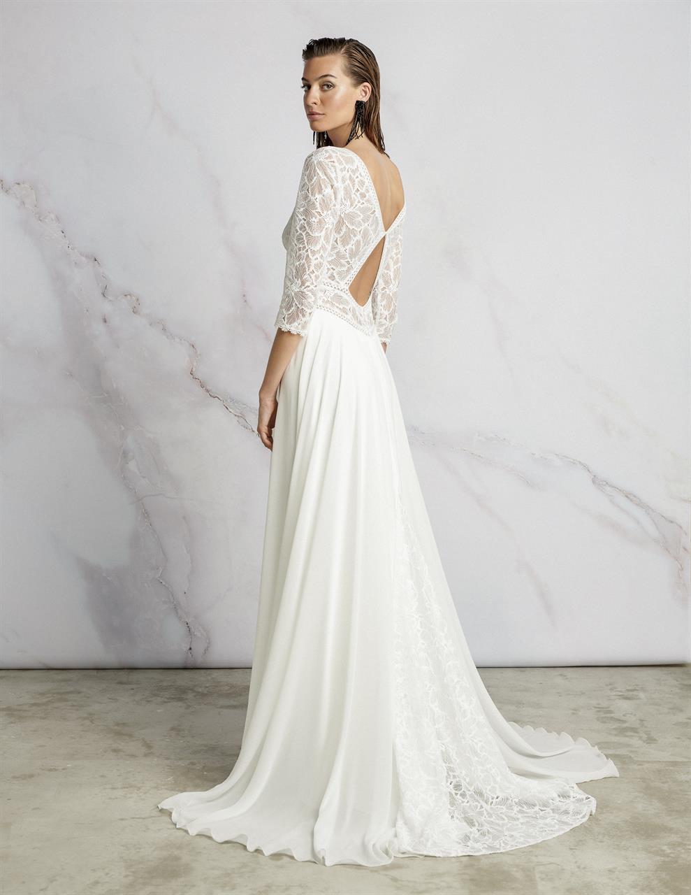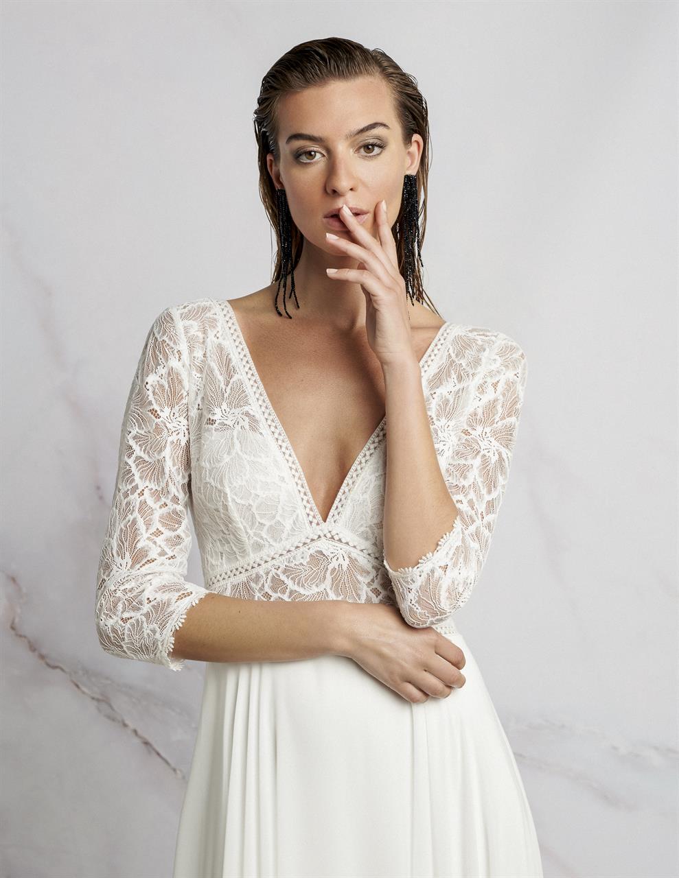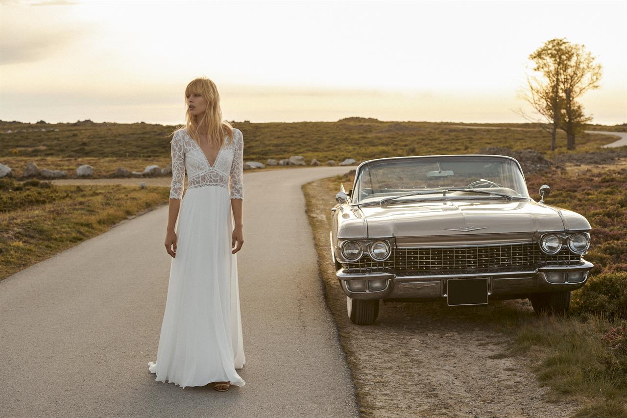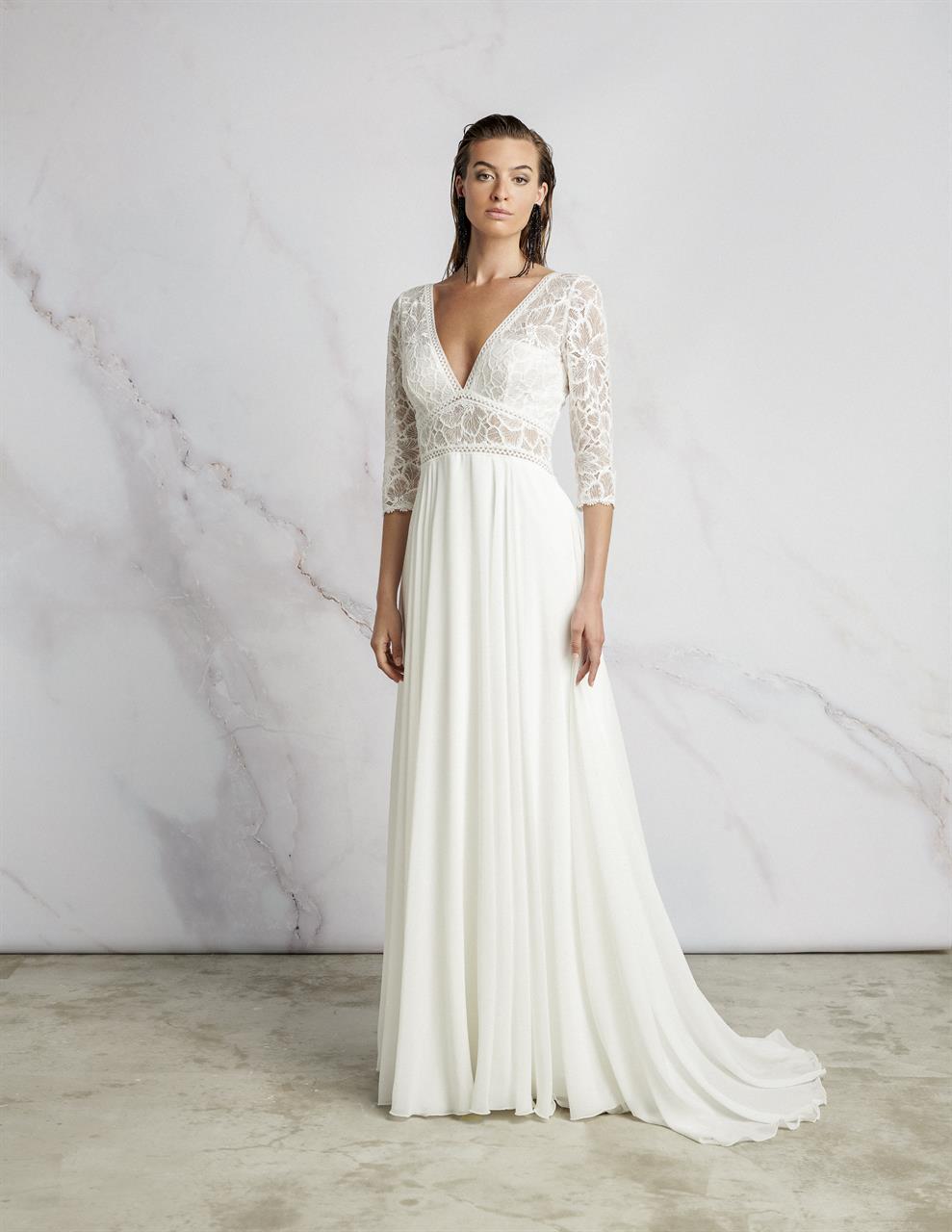 Maya est une magnifique robe en mousseline et en dentelle. Le haut a un décolleté en V.