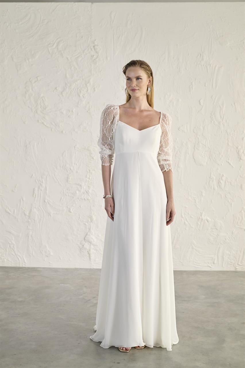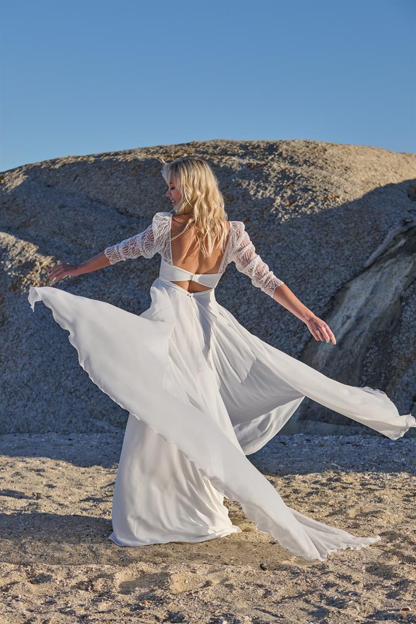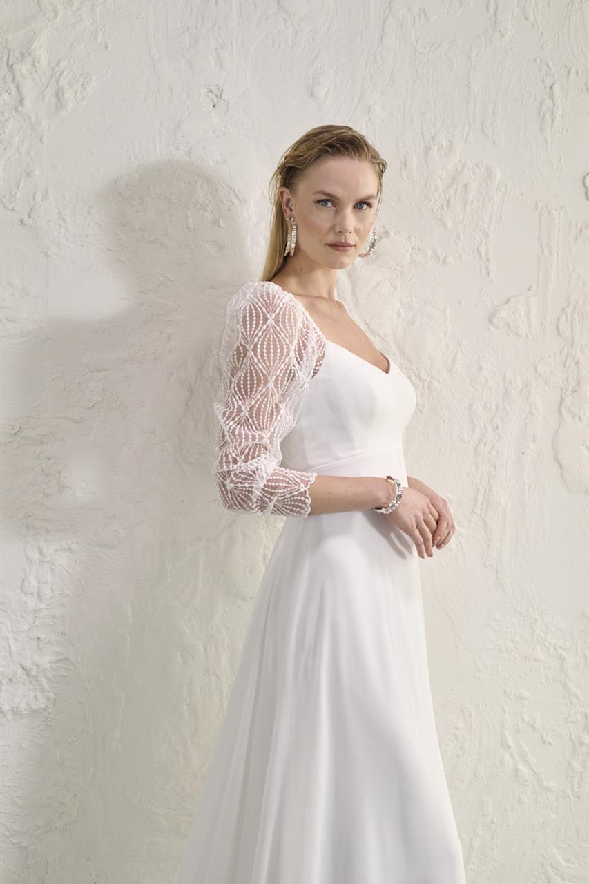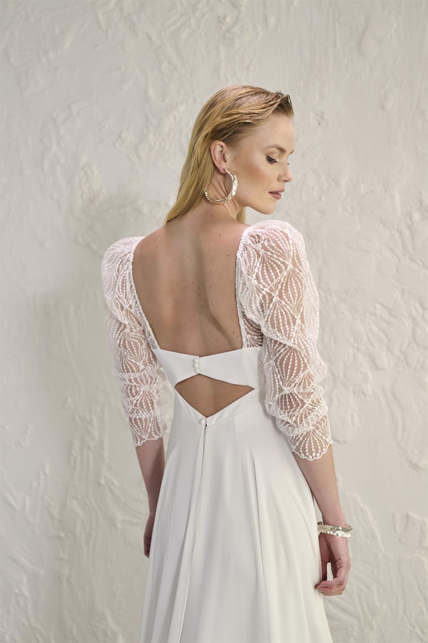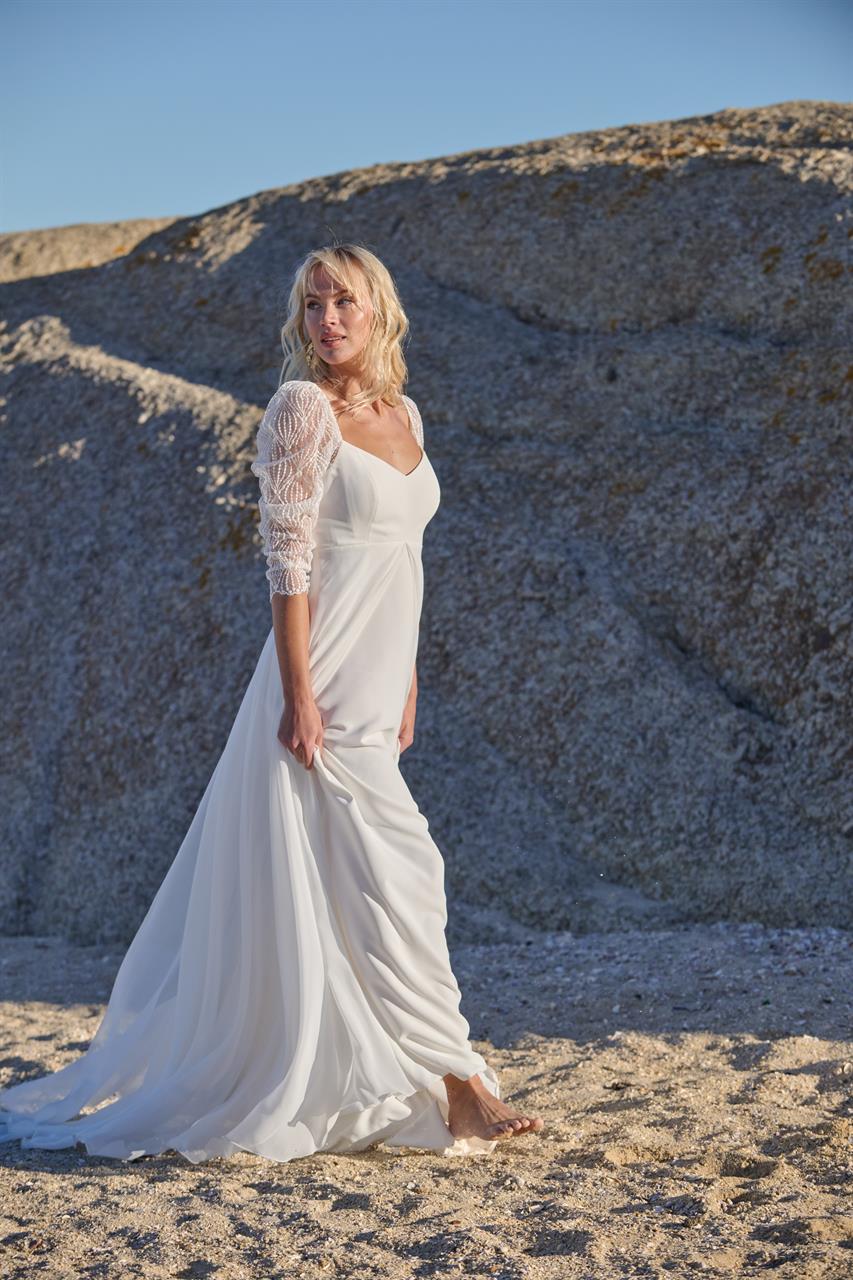 Superbe robe de la collection Rembo styling qui se compose d’une base en crêpe très légère. Le tout est recouvert de voile. Les manches et le dos apportent un côté assez original.